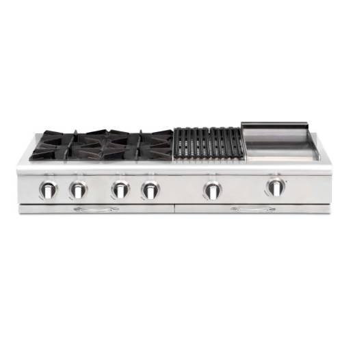 Powerful Open Top Burners Rated at 23,000 BTUs hr for all burners All burners are capable of turning down to provide True Simmer of 145 Cast Iron Wok Grate available as an accessory 12" Thermo Griddle with commercial grates, rated at 18,000 BTUs EZ-Glides - Full extension removable drip trays mounted on ball bearing rails Stay-Cool - Die cast, chrome plated metal knobs with Black Trims (cabernet red optional) Auto-ignition re-ignition on all open top burners Commercial Quality Cast Iron Grates with easy to clean matte porcelain finish Proudly Made In USA,ADA Compliant: No Amps: 15 Burners: 6 Collection: Culinarian Series Continuous Grates: Yes Control Type: Knobs Cooktop: Rangetop Cutout Depth: 23-1 8 Cutout Width: 46-15 16 Depth: 26-5 8 Downdraft Venting: No Finish: Stainless Steel Fuel Type: Gas Griddle: Yes Grill: No Height: 8-5 16 Hot Surface Indicator Light: No Ignition Type: Electronic Induction: No Modules Required: No Sabbath Mode: No Star-K Certified: No Style: Open Burner Surface Finish: Stainless Steel Voltage: 120 Weight: 270 lb. Width: 47-7 8,Image shows four-burner gas with 12" BBQ Grill and 12" Thermo-Griddle